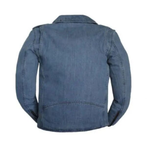 More: Denim Biker Jacket, Polyester, YKK Zipper, Buttons, Pockets, Buckle Strap, Blue Color, Hood, Genuine Jean Jacket 100% Hand-Made