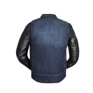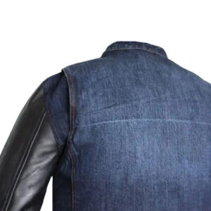 Classic blue denim body with smooth leather sleeves